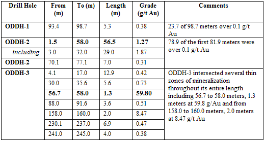 EMX drilled three core holes totaling 710.1 meters of sampling. Drill hole ODDH-1 was drilled at the northern most limit of the gold mineralized zone delineated by surface sampling. The hole intersected gold mineralization within a hornfels unit, thereby establishing the continuity of gold mineralization below cover and extending beyond the main granodiorite intrusive. Holes ODDH-2 and ODDH-3 intersected significant gold mineralization and altered granodiorite porphyry with abundant sheeted quartz veins and carbonate veining. A tabulation of significant gold intervals is given below.