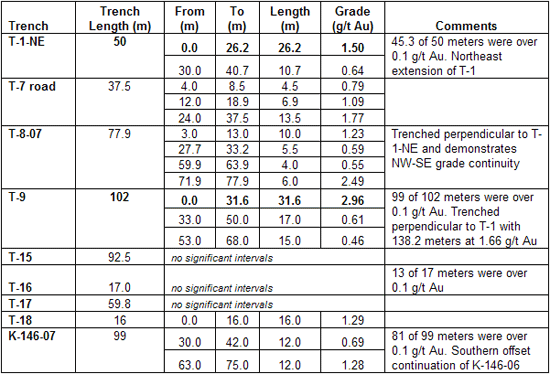 The 553 meters of trenches excavated in 2007 augmented the 1115 meters of previous EMX trenching, and were extensions to last year’s northeast trending trenches, or were cut perpendicular to them. The 2007 trench results are summarized in the table below:
