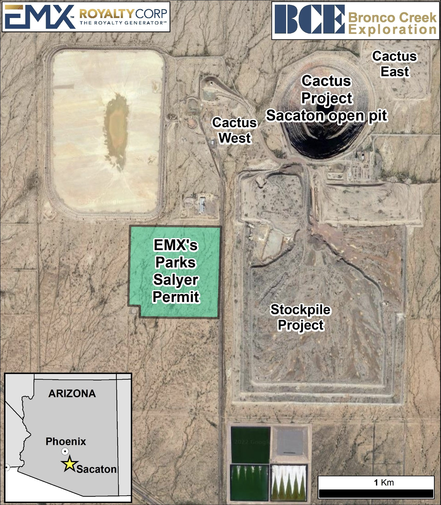 Vancouver, British Columbia, February 10, 2022 (NYSE American: EMX; TSX Venture: EMX; Frankfurt: 6E9) – EMX Royalty Corporation (the “Company” or “EMX”) is pleased to announce the execution, by its wholly-owned subsidiary Bronco Creek Exploration Inc., of an Assignment and Assumption agreement as well as a Royalty Agreement (the “Agreements”) for transfer of EMX’s Arizona State Exploration Permit (“Permit”) to Cactus 110 LLC, a wholly-owned subsidiary of Arizona Sonoran Copper Company, Inc. (TSX: ASCU) (“ASCU”). EMX’s Permit covers a portion of the Parks Salyer copper target, located approximately 1,500 meters southwest of the historic Sacaton open pit copper mine. Sacaton was previously operated by Asarco from 1972-1984 and is now being developed by ASCU and is known as the Cactus Project. The Agreements provide EMX with a one-time cash payment for the assignment of its rights under a State of Arizona Exploration Permit as well as a 1.5% net smelter return (“NSR”) royalty interest, work commitments, annual advance royalty payments, and certain milestone payments. EMX is pleased to see the Permit advance with ASCU as it continues to advance activities at its Cactus project.