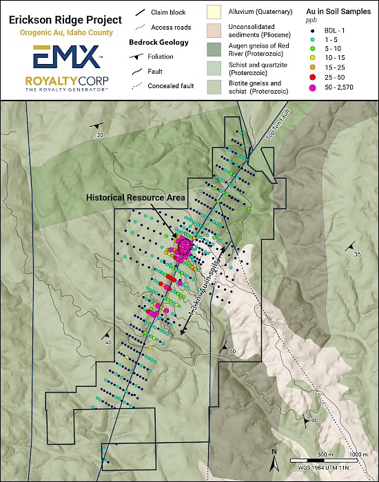 - Erickson Ridge: The Erickson Ridge project covers the northern extension of the Orogrande Shear Zone (”OSZ”) in the Elk City mining district, and hosts multiple historical shear-hosted gold resources (Figure 2), including a 1980s-era historical resource. Historical drill intercepts from the 1980s include 33.5 meters @ 4.1 g/t gold (ER-84-13 from 16.8m to 50.3 m) and 21.3 meters @ 3.15 g/t gold (ER-84-23 from 77.7 to 99.0 m) (disseminated-style mineralization, true thicknesses unknown)1.