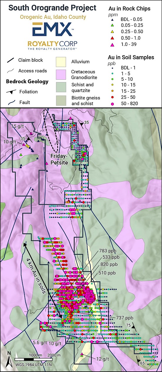 - South Orogrande: The project lies 16 km south of Erickson Ridge and covers approximately 11.5 km of strike length along the OSZ (Figure 3). South Orogrande is adjacent to, and along strike, of Endomines Inc’s Friday deposit which has historical open pit constrained mineral resources2. At South Orogrande, modern surface exploration (2018-2021) identified multiple km-scale, cohesive gold-in-soil anomalies (2×5 km and 1.5×3 km) with coincident geophysical anomalies in areas of minimal outcrop and widespread placer gold4.