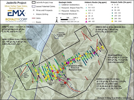 In 2012, limited shallow drilling was completed in the historical resource area, with highlight intercepts of 1.4m (101.4-102.8m) @ 692 g/t Ag, 5.7% Pb, 0.4% Zn, and 0.42 g/t Au (ABM-12-DH2) and 0.6m (100.4-101m) @ 1,106 g/t Ag, 0.65% Pb, 0.23% Zn, 0.81 g/t Au (ABM-12-DH4) (true thicknesses unknown)7. In 2021-2022, EMX leased the patented claims at Lakeview, and staked the surrounding open ground, marking the first time the district has been consolidated since initial discovery in the late 1800s.