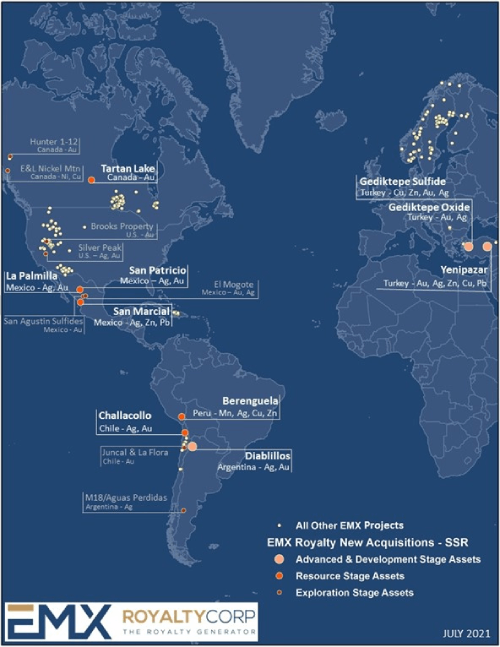 Vancouver, British Columbia, July 29, 2021 (NYSE American: EMX; TSX Venture: EMX; Frankfurt: 6E9) – EMX Royalty Corporation (the “Company”, or “EMX”) is pleased to announce that it has entered into an agreement (the “Royalty Purchase Agreement”) dated July 29, 2021 with SSR Mining Inc. and certain of its subsidiaries (“SSR Mining”) to purchase a portfolio of royalty interests and deferred payments (the “Royalty Portfolio”). The Royalty Portfolio consists of 18 geographically diverse royalties, with four royalty assets at advanced stages of project development, and also includes U.S. $18 million in future cash payments to be made to the owner of the Royalty Portfolio (see Figure 1 and Table 1). Upon closing of the transaction EMX will pay to SSR Mining U.S. $33 million in cash and U.S. $33 million in common shares of EMX. EMX will also make deferred and contingent payments to SSR Mining of up to U.S. $34 million if certain project advancement milestones are achieved. Further details of the commercial terms are provided below. Completion of the transaction is subject to customary closing conditions, including acceptance by the TSX Venture Exchange (the “TSX-V”).
