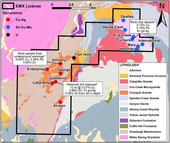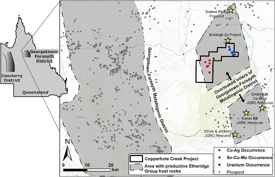 The polymetallic Copperhole Creek Project is located 20 km east of the Georgetown-Forsayth Metallogenic District in Queensland, with mineralization developed in the same host rocks as the Georgetown-Forsayth District. There are two main styles of mineralization recognized on the Copperhole Creek property, (1) tin-copper-molybdenum mineralization developed in zones of greisen-style alteration and (2) shear zone hosted copper-silver mineralized veins and breccias. Numerous occurrences, historical mines and prospects with either or both styles of mineralization occur on EMX’s land position (see Figure 2). Although the nearby Georgetown-Forsayth Metallogenic District is well known for its historical gold production, only a few of the occurrences at Copperhole Creek have been assayed for gold, adding further upside to the Project.
