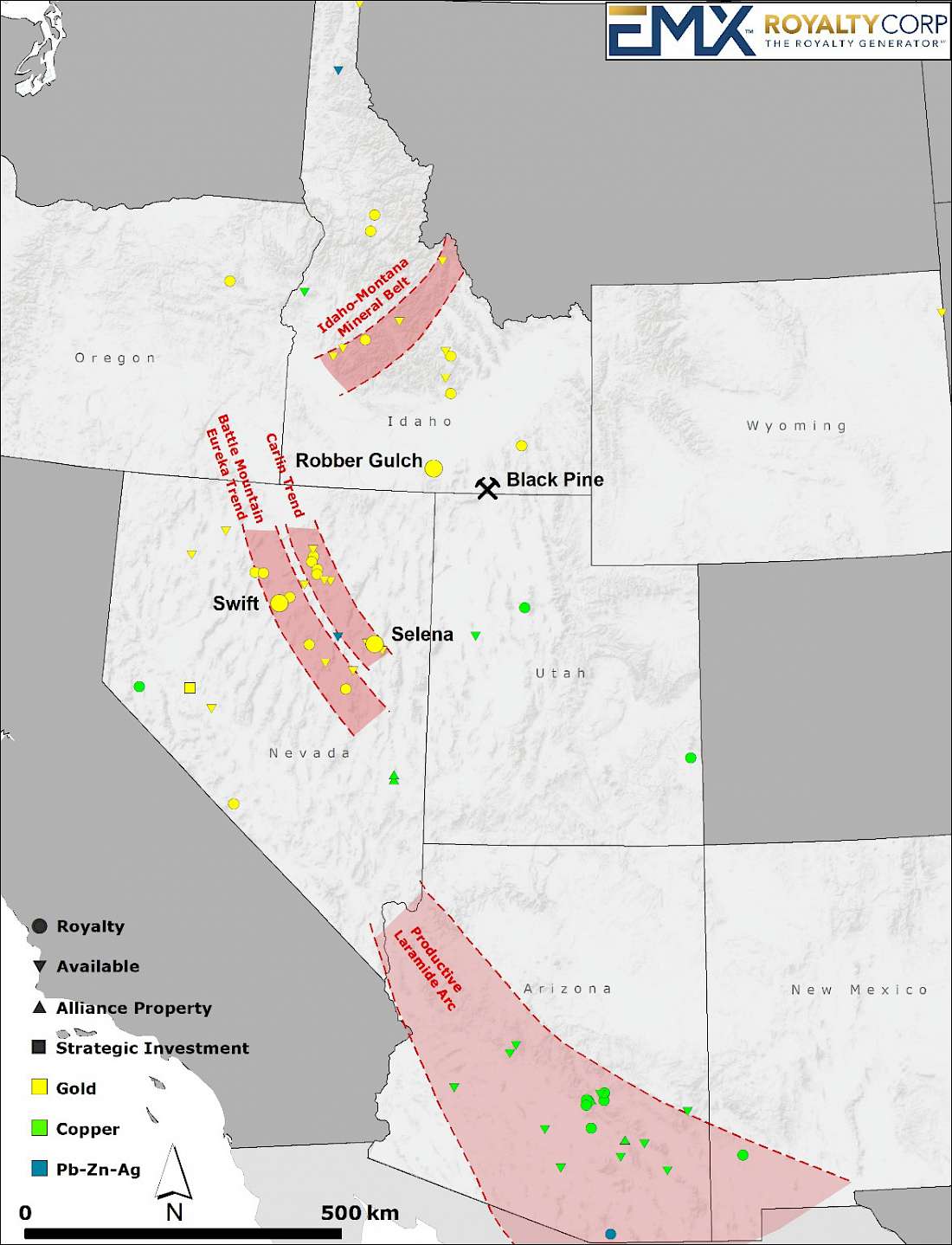 Vancouver, British Columbia, January 26, 2022 (NYSE American: EMX; TSX Venture: EMX; Frankfurt: 6E9) – EMX Royalty Corporation (the “Company” or “EMX”) is pleased to announce the execution, by its wholly-owned subsidiary Bronco Creek Exploration Inc., of an exploration and option agreement (the “Agreement”) for the sale of the Robber Gulch gold project (“Project”) in Idaho to Ridgeline Exploration Corporation, a wholly-owned subsidiary of Ridgeline Minerals Corp. (TSX-V: RDG) (“Ridgeline”). The Agreement provides EMX with cash payments, share payments, and work commitments during Ridgeline’s earn-in period, and upon earn-in a retained 3.25% net smelter return (“NSR”) royalty interest, annual advance royalty payments, and certain milestone payments.
