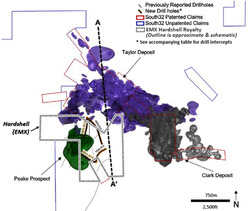 Figure 1. Peake drilling and mineralized domain with EMX Hardshell royalty boundary as well as Taylor & Clark mineralized domains. Figure modified from figure 5 of South32 news release dated July 24, 2023.