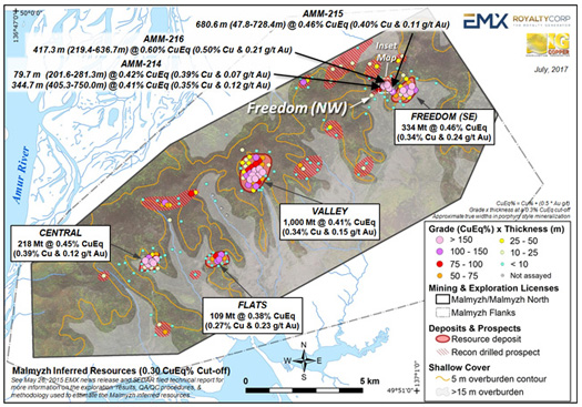 Vancouver, British Columbia, July 25, 2017 (TSX Venture: EMX; NYSE American: EMX) – EMX Royalty Corporation (the “Company” or “EMX”) is pleased to announce 2017 drill results from the Malmyzh copper-gold porphyry project’s Freedom Northwest prospect. These results include an intercept of 417.3 meters (219.4-636.7 m) averaging 0.60% copper equivalent (0.50% copper and 0.21 g/t gold), including a higher grade sub-interval of 142.6 meters (255.4-398.0 m) averaging 0.74% copper equivalent (0.62% copper and 0.26 g/t gold) from hole AMM-216. The mineralization is principally hosted in magmatic-hydrothermal breccias. The ongoing exploration program at Freedom Northwest represents the first deep drill testing at Malmyzh, as previous drilling has been concentrated on shallow mineralization throughout the district. Freedom Northwest is not included in the current Malmyzh resource estimate, which further emphasizes the project’s exploration upside.