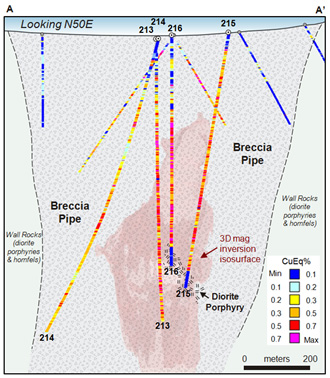 AMM-214 was angled towards the northwest margin of the pipe and terminated in hydrothermal breccias. AMM-215 was collared ~250 meters east-southeast of AMM-214, and angled towards the center of the breccia pipe, intersecting continuous copper-gold mineralization over 680.6 meters. AMM-216, approximately on the same drill fence as AMM-215 and collared ~170 meters to the northwest, was drilled vertically near the center of the pipe, and intersected robustly mineralized hydrothermal breccias over 417.3 meters.