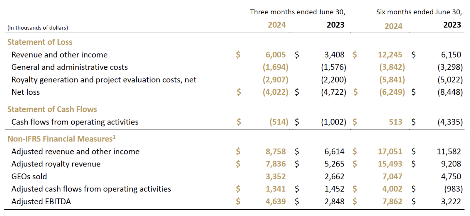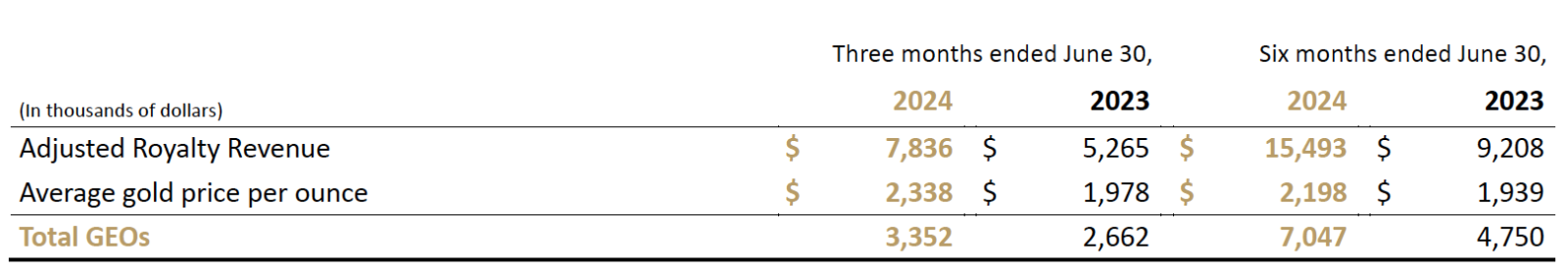 The following table is a summary of GEOs1 sold and adjusted royalty revenue1 for the three months ended June 30, 2024 and 2023: