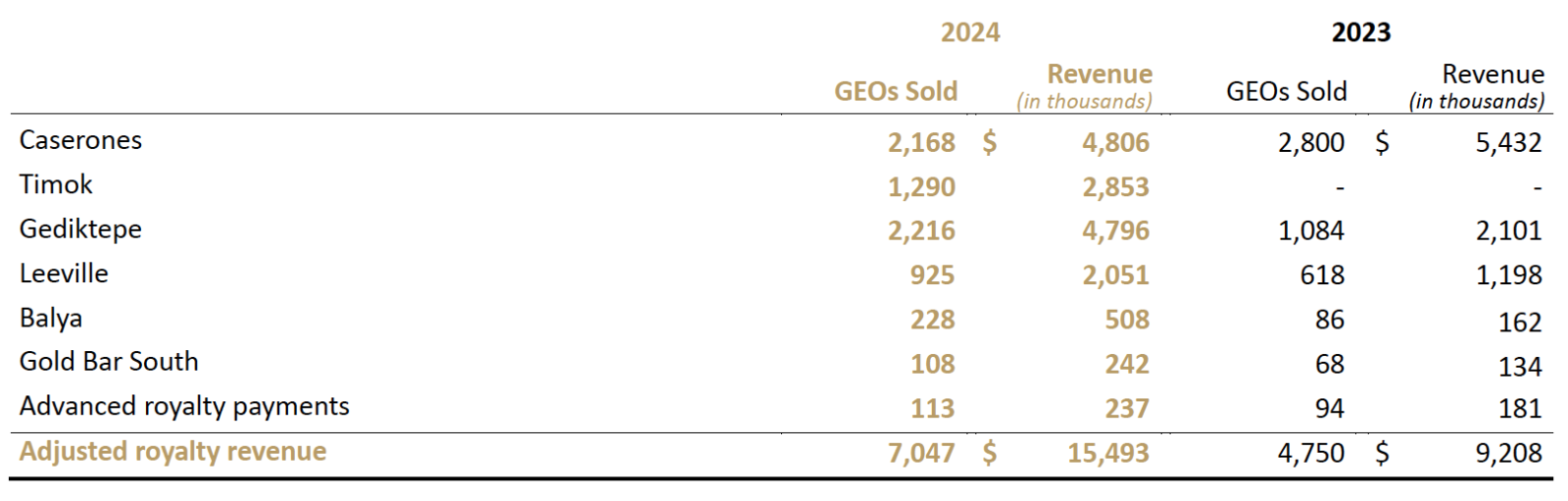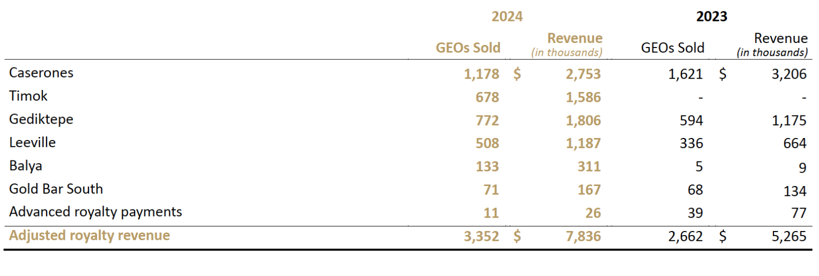 The following table is a summary of GEOs1 sold and adjusted royalty revenue for the six months ended June 30, 2024 and 2023: