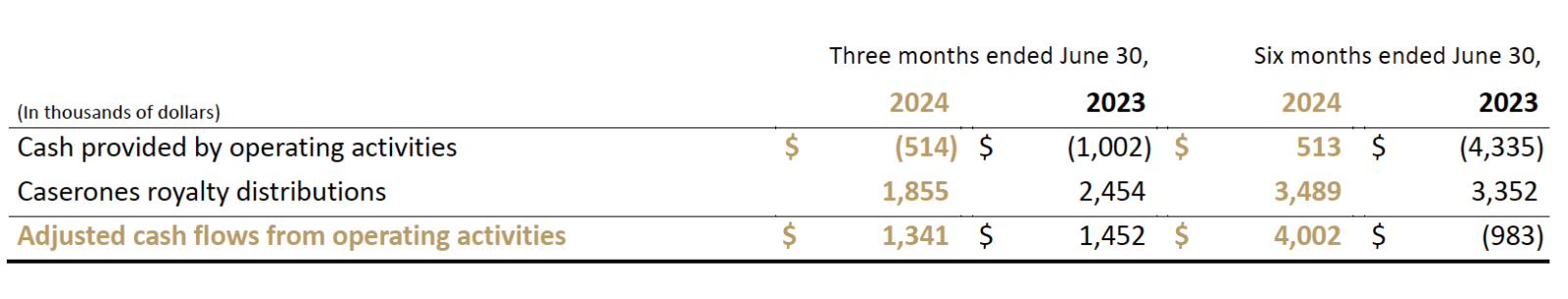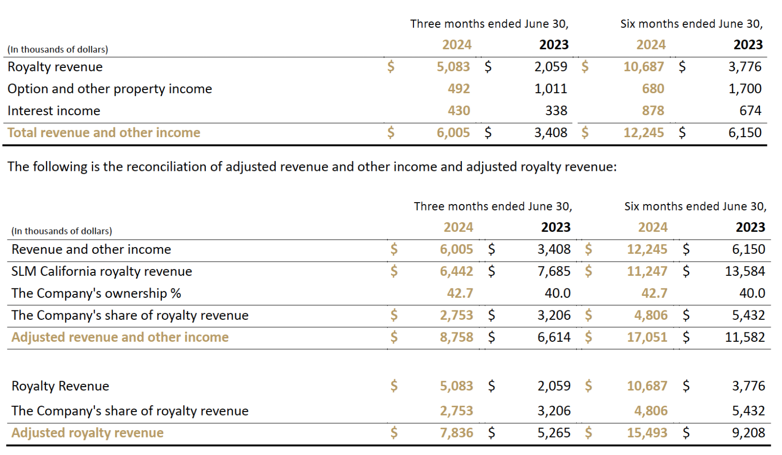 In Q2 2024, the Company recognized $8,758,000 and $7,836,000 in adjusted revenue and other income1 and adjusted royalty revenue, respectively, which represented a 32% and 49% increase, respectively, compared to Q2 2023. The significant increase is due to the commencement of royalty payments in Q3 2023 from the Timok royalty property, as well as a 54% increase in royalty revenue from Gediktepe and a 79% increase in royalty revenue from Leeville when compared to Q2 2023.