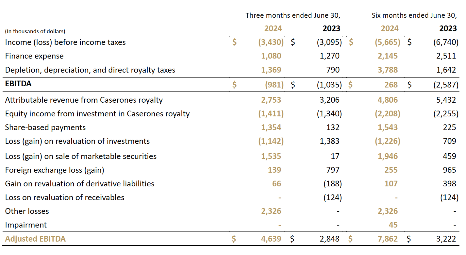EBITDA represents net earnings or loss for the period before income tax expense or recovery, depreciation and amortization, finance costs. Adjusted EBITDA adds all revenue from the Caserones Royalty less any equity income from the equity investment in the Caserones Royalty. Additionally, it removes the effects of items that do not reflect our underlying operating performance and are not necessarily indicative of future operating results. These may include: share based payments expense; unrealized and realized gains and losses on investments; write-downs of assets; impairments or reversals of impairments; foreign exchange gains or losses; and other non-cash or non-recurring expenses or recoveries. |