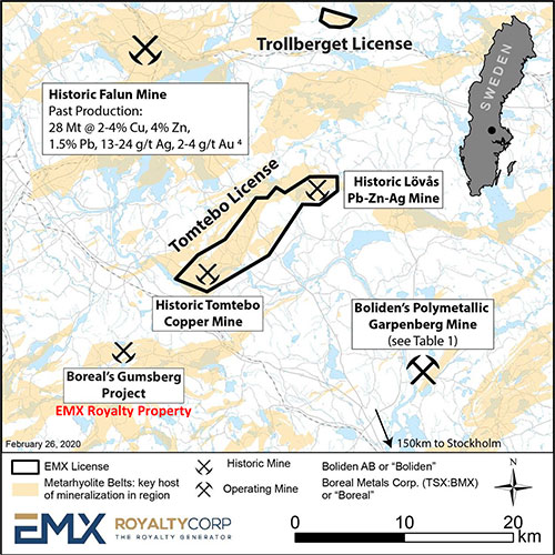Vancouver, British Columbia, February 28, 2020 (NYSE American: EMX; TSX Venture: EMX) – EMX Royalty Corporation (the “Company” or “EMX”) is pleased to announce the execution of an agreement for the sale of the Tomtebo and Trollberget polymetallic projects (the “Projects”) in Sweden to District Metals Corp. (TSX-V: DMX) (“District”). The agreement provides EMX with a 9.9% equity interest in District, annual advance royalty payments, 2.5% Net Smelter Returns (“NSR”) royalty interests in the Projects, and other considerations.