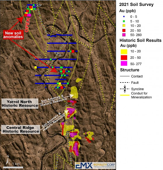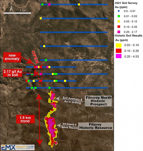 In Q3 and Q4 2021, EMX conducted a broad soil geochemical survey to the north of the Fitzroy historical resource (see Figure 2). A total of 351 samples were collected on 200 meter and 400 meter spaced traverses with samples collected every 50 meters along each line. This program resulted in the delineation of multiple anomalous gold-in-soil trends. The most prominent anomaly extends for 400 meters along trend and reaches a maximum width of 200 meters at its northern extent. The anomaly remains open to the north and includes a sample of 2.17 ppm gold. This new soil anomaly is similar in scale and tenor to those around the historic Fitzroy prospect located 1km to the southeast. This anomaly also exhibits coincident anomalous molybdenum and tellurium geochemistry, similar to geochemical signatures seen at Fitzroy, and closely correlates with the mapped extent of a zone of hydrothermal breccias, quartz veining and alteration.
