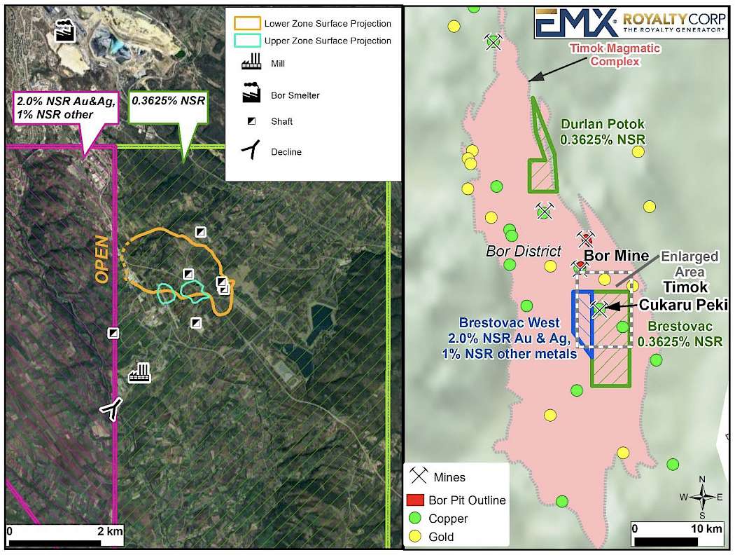 EMX congratulates Zijin on its outstanding performance in the Bor and Timok districts in Serbia. EMX currently holds a 0.3625% NSR royalty over Zijin’s Brestovac exploration permit area (including the Cukaru Peki Mining licenses), as well as portions of Zijin’s Jasikovo-Durlan Potak exploration license north of the currently active Bor Mine. EMX also owns a 2% NSR royalty on precious metals and a 1% NSR royalty on base metals on the Brestovac West License, which lies immediately adjacent and to the west of the Brestovac Mining License and the Cukaru Peki Mine (see Figure 1). All of EMX’s Timok royalties are uncapped and cannot be repurchased or reduced. The Company is currently receiving quarterly royalty payments from Zijin for copper and gold production from the Cukaru Peki Mine.