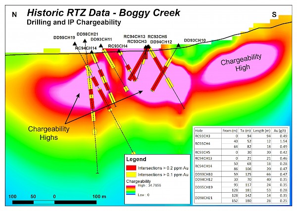 Cross-section of historic drilling at Boggy Creek prospect. Mineralization from RTZ’s 1993 drilling is coincident with IP chargeability highs. True widths of drill intercepts unknown.