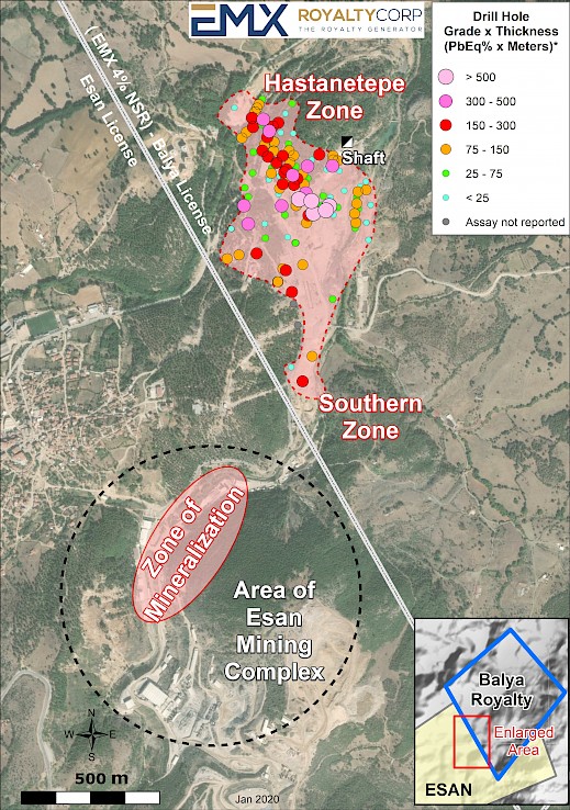 Vancouver, British Columbia, January 7, 2020 (TSX Venture: EMX; NYSE American: EMX) – EMX Royalty Corporation (the “Company” or “EMX”), through its wholly owned subsidiary Eurasia Madencilik Ltd. Sti., is pleased to announce the transfer of the Company’s Balya polymetallic1 royalty property in Turkey (the “Property”) from Dedeman Madencilik San. ve Tic. A. Ş. (“Dedeman”) to Esan Eczacibaşi Endüstriyel Hammaddeler San. ve Tic. A.Ş. (“Esan”). Esan is a private Turkish company that operates 40 mines and eight processing plants, and is one of Turkey’s leading producers of raw materials and base metals (see https://www.esan.com.tr/en/about-us/history for more information). Most importantly, Esan operates a lead-zinc mine and flotation mill on the property immediately adjacent to EMX’s Balya royalty property. EMX retains a 4% net smelter return (“NSR”) royalty on the Property that is uncapped and cannot be repurchased.