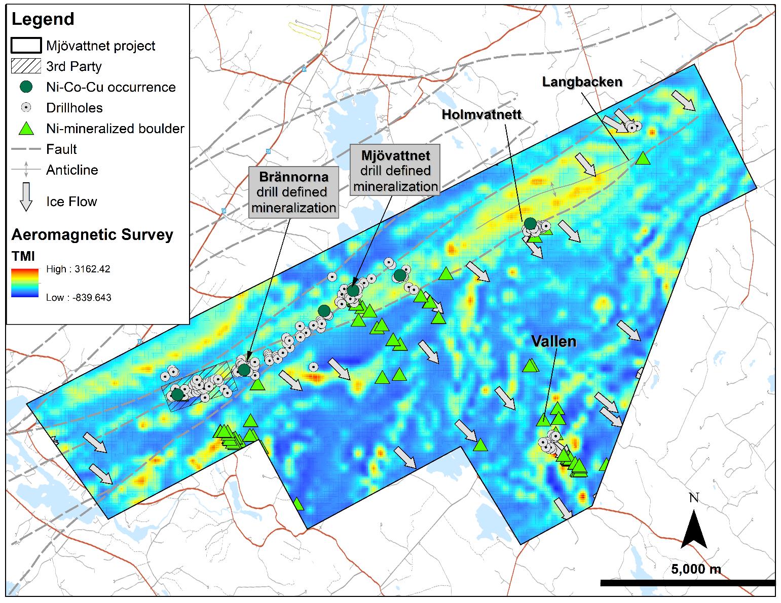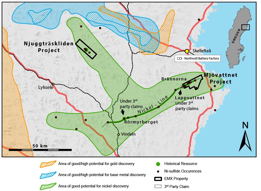 Mjövattnet Project. The translation of Mjövattnet is “mead water” in English, which was one of the first nickel sulfide discoveries made along the Nickel Line. Discovered in 1971, the Mjövattnet nickel sulfide deposit occurs along a structural corridor of similar mineralized bodies, including the Lappvattnet Brannorna, and Lappbacken zones to the southwest, each of which have drill defined zones of mineralization, with the latter two also lying within the EMX license (See Figure 2; note that Lappvattnet is currently held by a third party). Notes from the Swedish Geological Company (“NSG”) in 1987 state that Mjövattnet has only been partly explored and its depth potential remains unknown. Likewise, several clusters of nickel sulfide bearing boulders lie to the northeast and southeast (the Frangsmyran, Holmsvattnet, Långbacken and Vallen occurrences), the bedrock sources of which have yet to be identified.