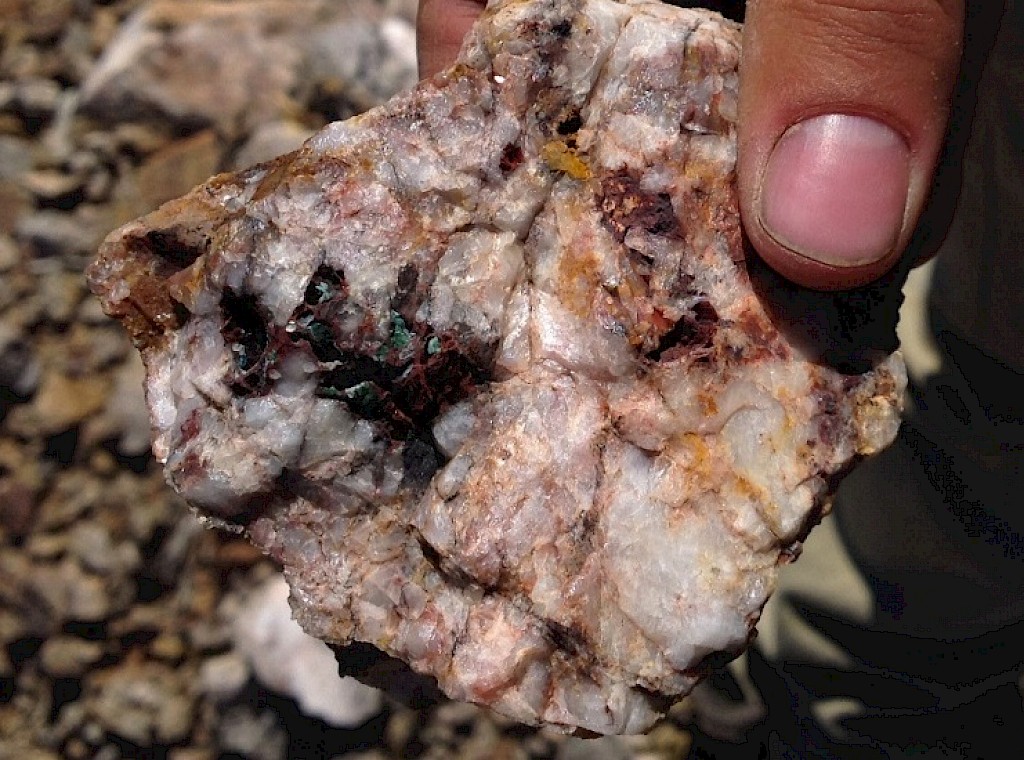 Historic drilling intersected sericitized porphyry dikes and host rocks with up to 5-7 vol% pyrite beneath shallow (<80 meters) pediment. Visible Cu-oxide mineralization is present in drill cuttings surrounding the collars. The historic drill holes were all shallow, designed to test for the limits of the alteration footprint of the southern system. Both systems remain open in all directions.