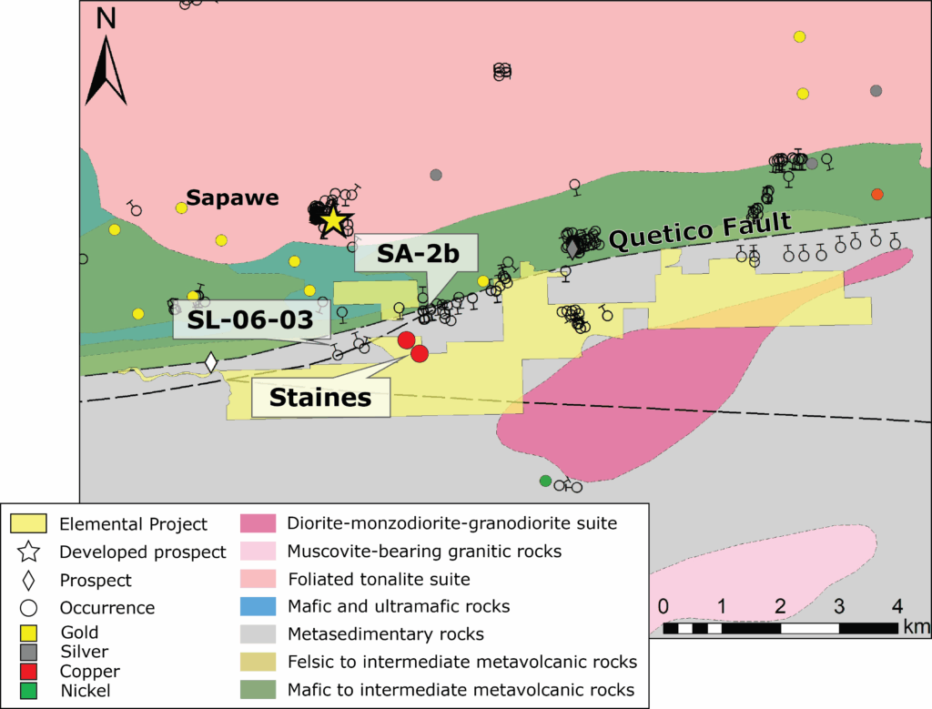 The Quetico fault separates the granite greenstone Wabigoon Subprovince from the metasediments and metasedimentary derived intrusions of the Quetico suprovince.1 The Quetico fault is proximal to a number of mafic intrusive bodies called the Atikokan River Intrusions (ARI), which are a series of linear, east-northeast trending mafic to ultramafic intrusions prospective for Fe-Cu-Co-Ni mineralization in the Sapawe-Atikokan area.