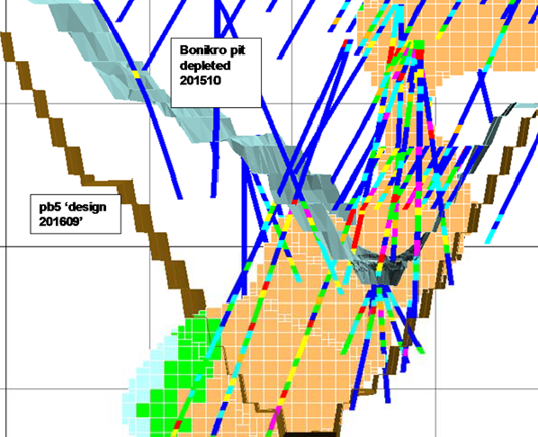 The Bonikro deposit lies within the Birimian Baoulé-Mossi Domain of the West African Craton, a prolific gold producing region. Mineralization at Bonikro is interpreted as an intrusion-related gold system deposit overprinted with orogenic mineralization. The deposit is comprised of a suite of sub-parallel quartz vein-filled structures exhibiting two geometries: those that dip to the northeast, and a shallower, west-dipping suite.