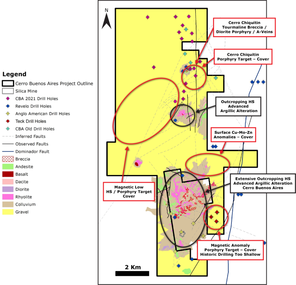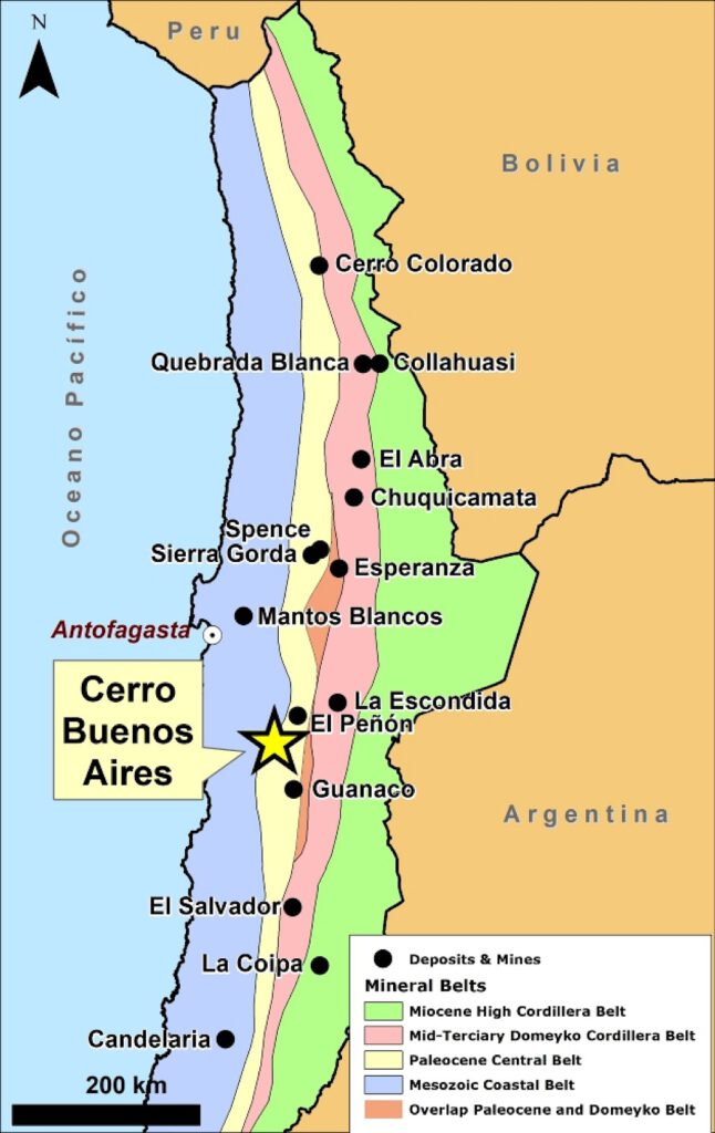 Cerro Buenos Aires lies within the Paleocene volcanic belt of northern Chile, which hosts significant copper deposits such as Cerro Colorado (BHP) and Relinch (Nueva Union-Teck-Goldcorp). The project targets large outcrop areas that display characteristics of upper portions of a porphyry copper system and additional aspects of a high-sulfidation precious metals system.