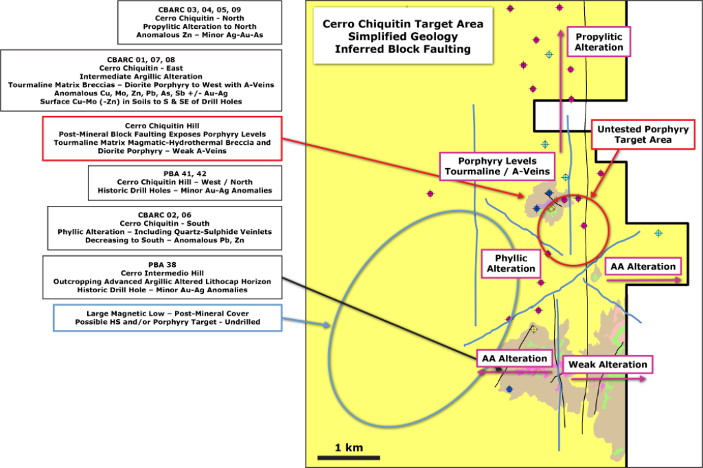 Historical operators completed heli-borne magnetics and TEM that resulted in multiple anomalous zones interpreted as magnetite-destructive advanced argillic alteration. Historical drilling targeted magnetic highs that were thought to be associated with hypogene porphyry copper centers. However, the 3, 300-meter drillholes, completed by Teck, did not drill deep enough to test the potential of the system.