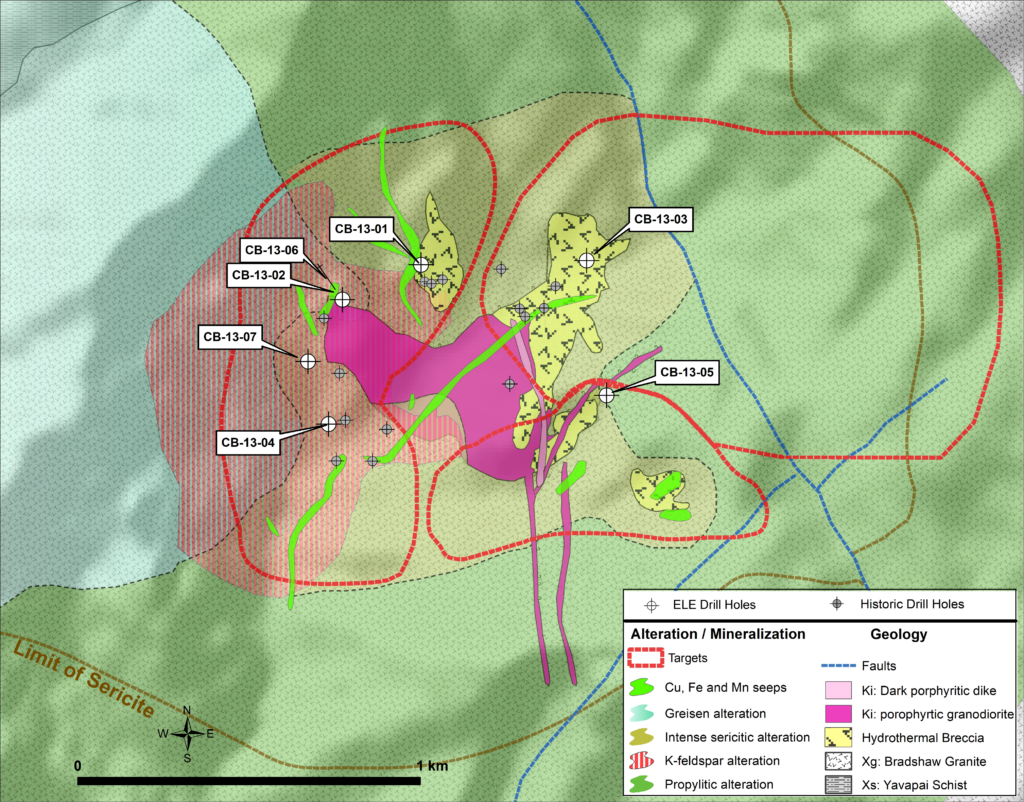 A partner-funded, seven hole diamond drill campaign totaling 2,776 meters was completed in 2013. The drill results indicated the mineralized system starts at the surface, and six of the seven drill holes bottomed in copper-molybdenum mineralization. Hole CB-13-01 was altered and mineralized over its entire 919.7 meter length, and averaged 0.34% copper equivalent (0.18% Cu and 0.029% Mo).1 Another partner-funded drill program in 2014 consisted of three core holes totaling 1,140 meters that partially tested the western and central target areas. This drilling intersected anomalous (~0.04-0.20% Cu) to low grade (~0.2-0.4% Cu) mineralization, and yielded geologic results consistent with Bronco Creek’s model of a tilted porphyry system. This drilling, combined with results from the 2013 program, indicate the potential for higher-grade zones north and east of the areas drill tested to date.
