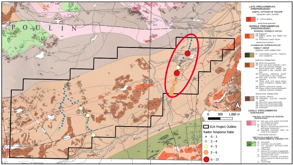 In 2022, Elemental geologists conducted a short prospecting trip where the presence of red and green beds was validated. Dark grey lenses were also observed within the more reduced, green beds, which may be providing organic carbon as a reducing agent for the sandstone. In 2023, Elemental geologists conducted a soil radon gas survey to help identify potential areas of interest within the Lorrain formation. This yielded several anomalous sites, possibly indicative of Uranium mineralization not exposed at surface.