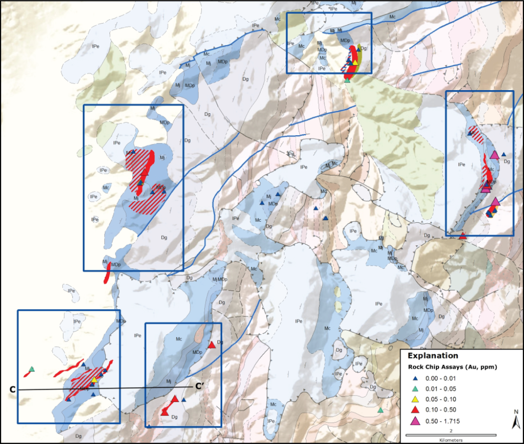 Alteration and mineralization are localized at the stratigraphic contacts between silicliclastic and carbonate units of Devonian to Mississippian age. Extensive concordant and discordant zones of hydrothermal alteration are characterized by jasperoid, de-calcification, dolomitization, and sulfide veining. Anomalous to highly anomalous gold and pathfinder elements (As, Sb, Hg, Tl) are distributed throughout the altered zone and highlighted by rock chip and BLEG sampling.