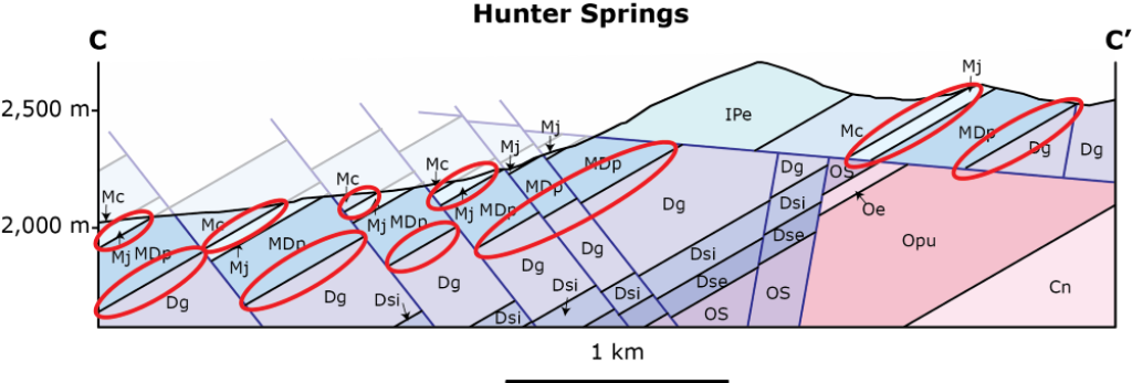 Post-mineral extension has resulted in the structural dismemberment of the hydrothermal system across the range. Where extensional faults juxtapose adjacent stratigraphic units, they conceal prospective stratigraphic contacts beneath approximately 100 meters of structural cover. In addition, the extensional faulting preserves the west-tilted target rocks at shallow depths (see cross section below), and create large untested target areas.