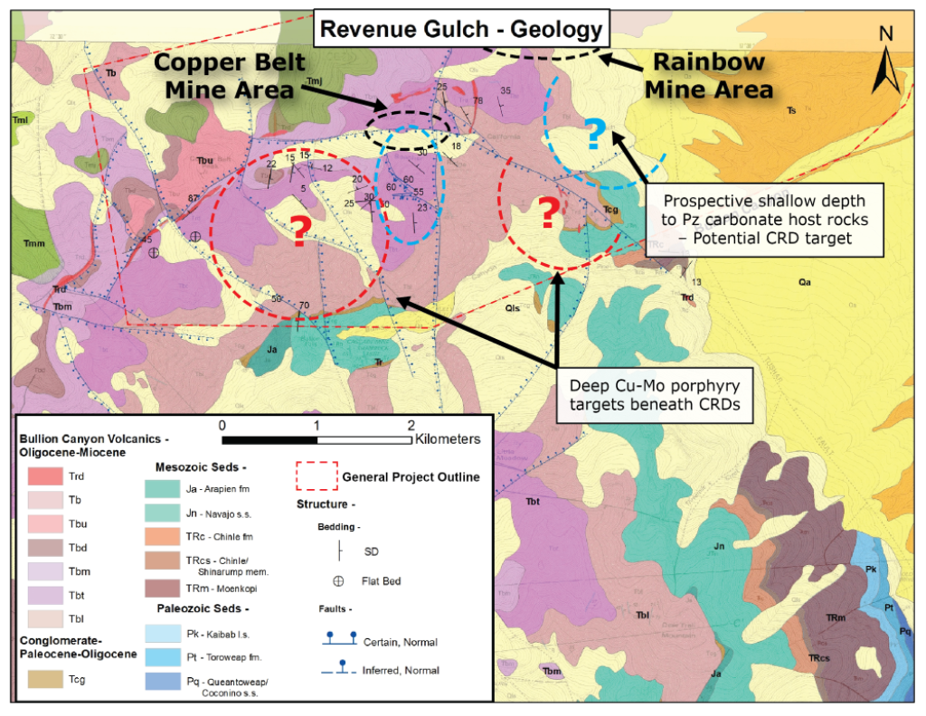 The Revenue Gulch target concept was generated as part of an exploration alliance with a focus in Utah to explore the Tertiary magmatic arc in western Utah. To the south of Revenue Gulch, MAG Silver has recognized carbonate replacement mineralization at their Deer Trail Project and proposed that porphyry “hubs” underlie Mt. Brigham and Deer Trail Mountain. However, there is evidence for additional base metal mineralization much farther north at the Rainbow and Copper Belt Mines, which is unrelated to the hydrothermal systems at Deer Trail. Bronco Creek recognized alteration and mineralization zonation, as well as outcrops and occurrences of porphyry dikes, which suggest there is a separate porphyry center (or several) north of the Deer Trail Mine area.